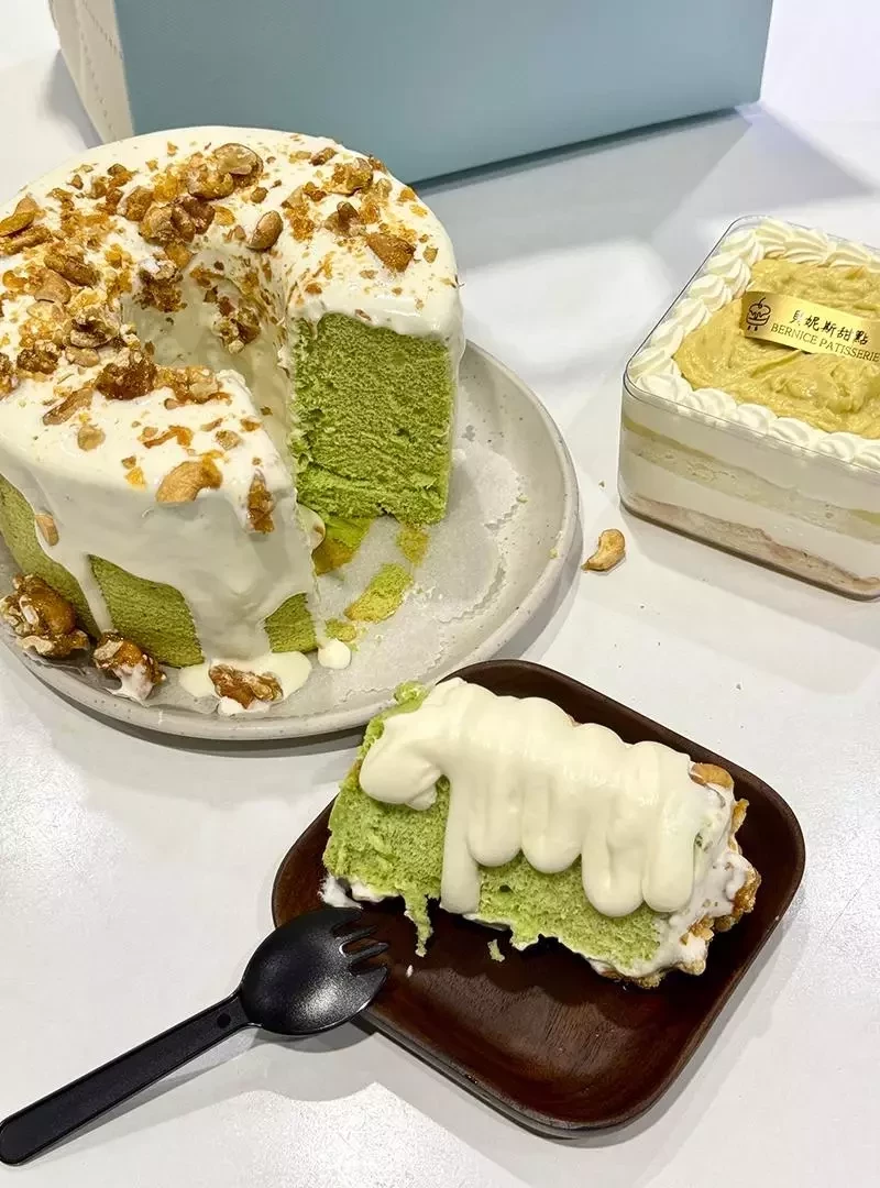 貝妮斯甜點店以其獨特的甜點系列而聞名,其中最受歡迎的莫過於他們的班蘭蛋糕。這款蛋糕以新鮮班蘭葉萃取精華和椰子油、日本麵粉製作而成,口感輕盈蓬鬆,甜度低,微鹹奶蓋提升了蛋糕的濕潤度,再搭配焦糖堅果,讓整體風味變得豐富更有層次。每一口都讓人感受到來自馬來西亞的風情和美味。